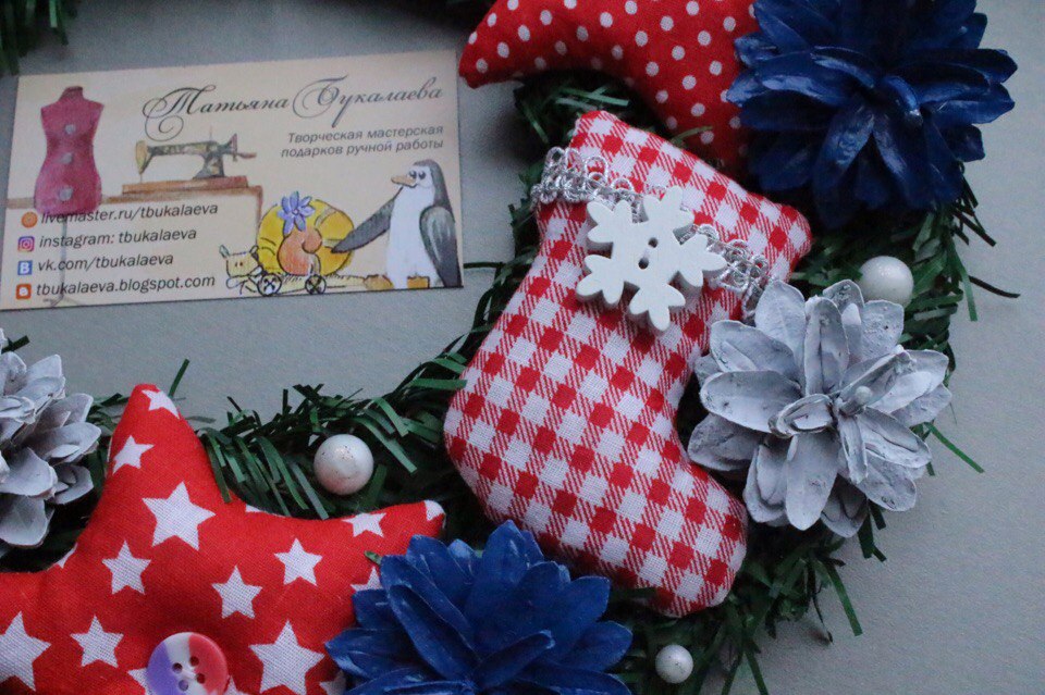Яркий и праздничный новогодний веночек! Украшен белыми и синими шишками, игрушками из хлопка, бусинами, деревяными бирочками. Диаметр веночка 26 см, размер игрушек - 8 см.