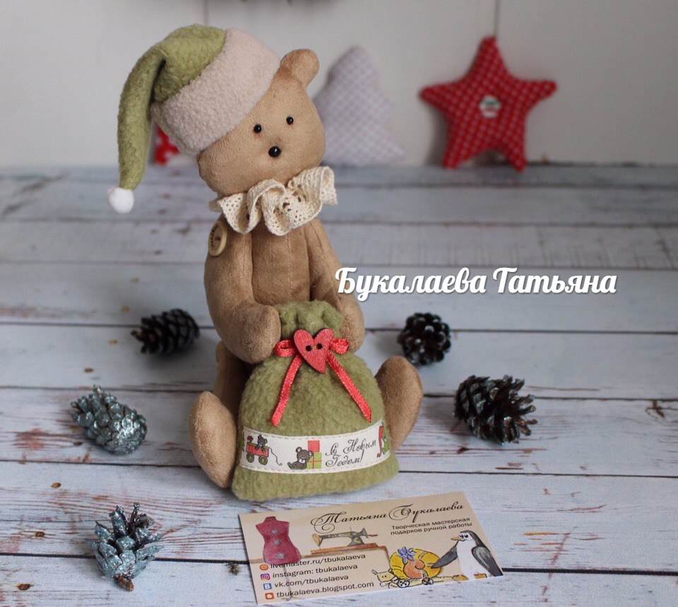 Мишка с мешком подарков, сшит из мягкой и приятной на ощупь замши, в лапках флисовый мешок, украшенный деревянным сердечком и атласным бантиком, полный рост с шапкой 24 см, сидя - 17 см, шапка и мешочек не снимаются, мишка станет праздничным украшением новогоднего интерьера или подарком для вашего малыша.