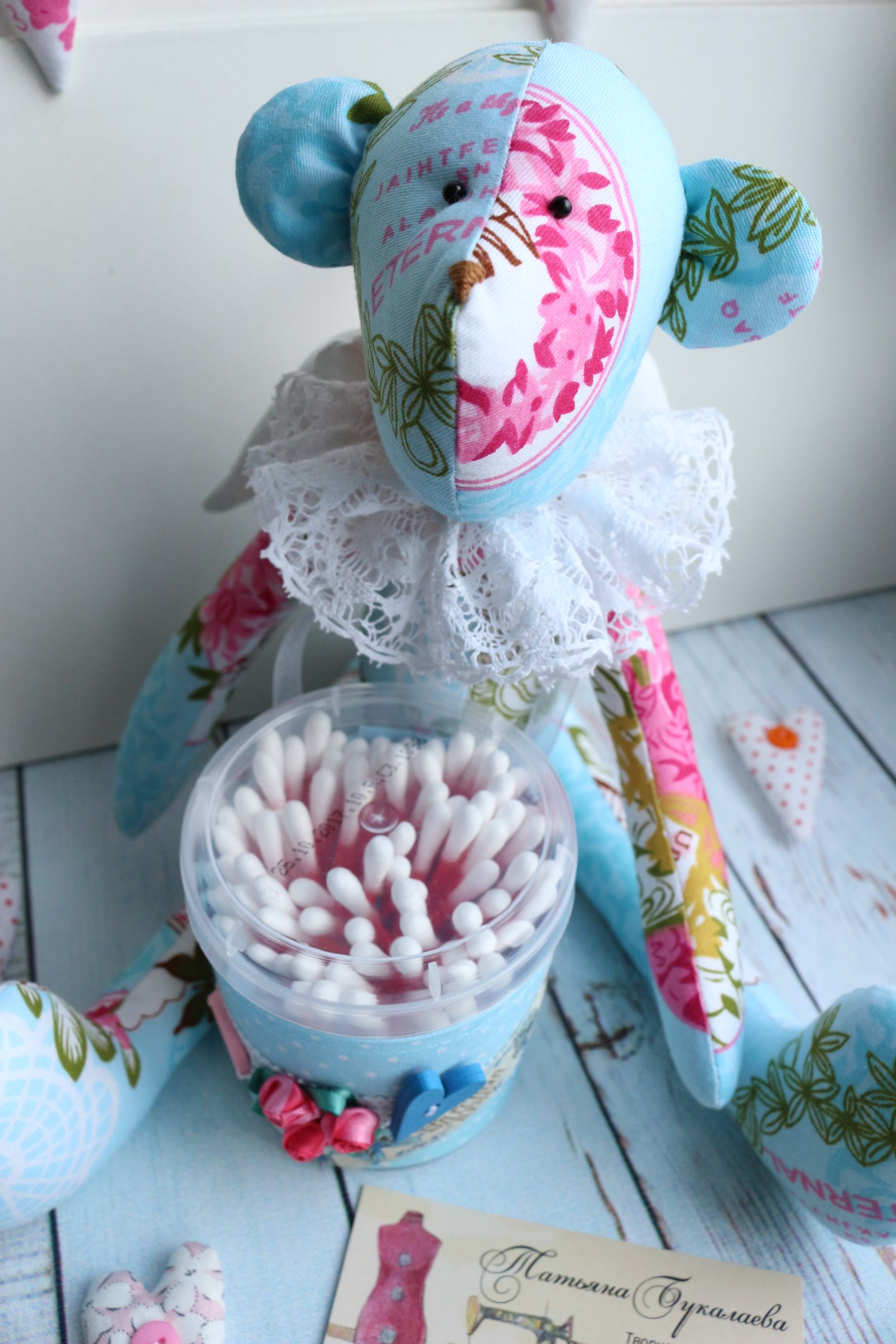 Мишка - хранитель ватных палочек. Полный рост 34 см, сидя - 19 см. Мишка сшит из хлопковой ткани в приятных голубых и розовых оттенках с тематикой Парижа. Мишка украсит собой ванную комнату или спальню, уголок, где его обладательница будет наносить макияж. Мишка может быть отдельной игрушкой, баночка с палочками легко снимается, баночку можно использовать многократно, так же возможна замена палочек с баночкой. Мишка-ангелочек несомненно создаст уют и будет радовать своим ярким и аккуратным видом.