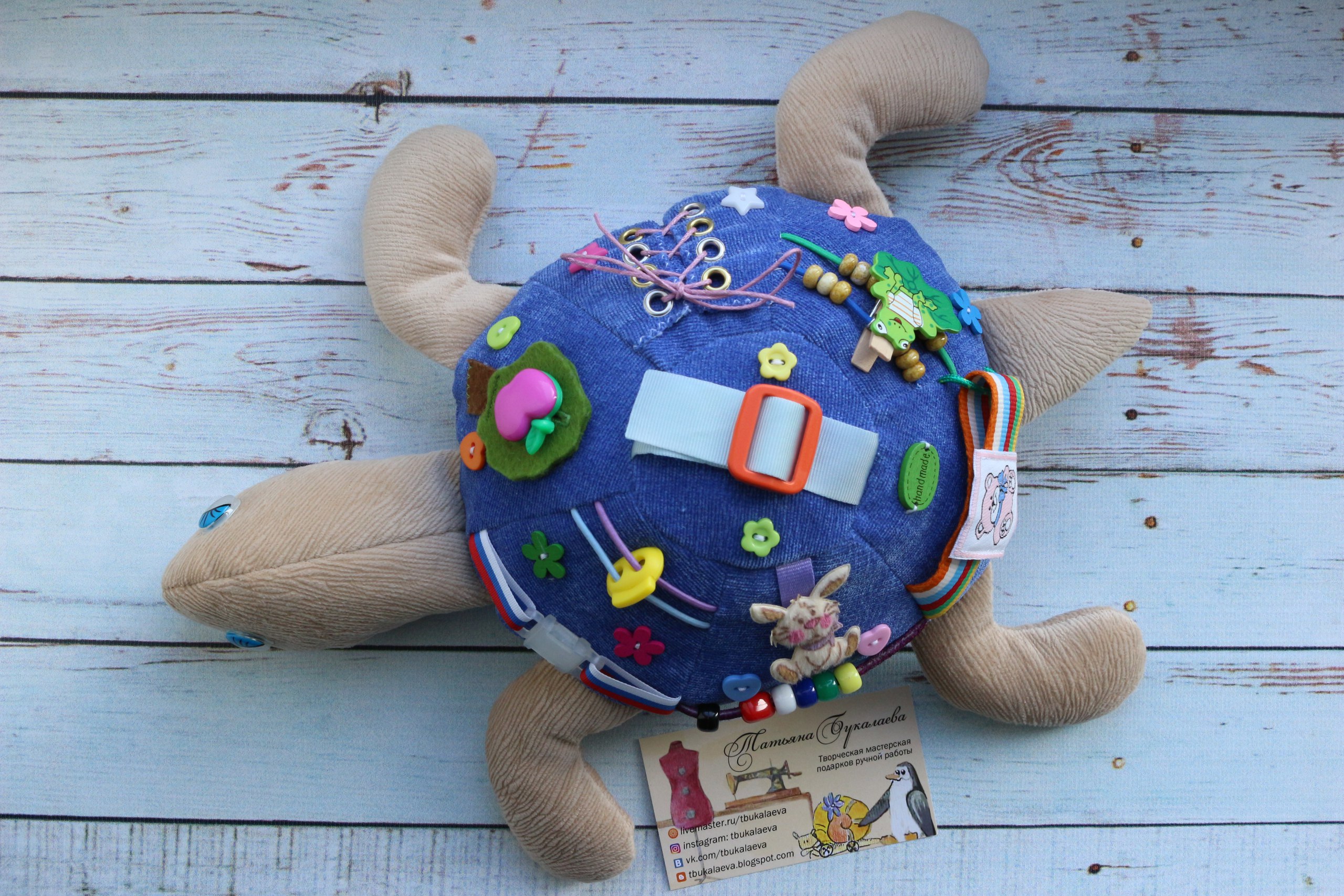 Развивающая игрушка черепашка, эта маленькая помощница познакомит ребенка с пуговкой, кнопкой, липучкой, прищепкой, шнуровкой, различными фиксаторами и крепежами. Черепашка сшита из мягких приятных тканей, все элементы яркие и частично съемные, а это значит, что черепашку можно спокойно брать с собой куда угодно и не бояться потерять мелкие детали. Эта черепашка предназначена для малыша, начинающего тактильно познавать мир, будет интересна в первую очередь деткам 1-3 лет, а так же при совместных играх со старшими братьями и сёстрами. С помощью этой черепашки можно изучать различные цвета, учиться считать: Сколько у черепашки лапок? Сколько у черепашки глазок? Научившись играючи пользоваться пуговками, липучкой и шнуровкой, малыш сможет самостоятельно пытаться одеваться, что будет несомненным плюсом для тех, кто ходит в детский садик. Все черепашки хоть и похожи, но не имеют точных копий, вы можете стать обладателем эксклюзивной помощницы для вашего малыша.