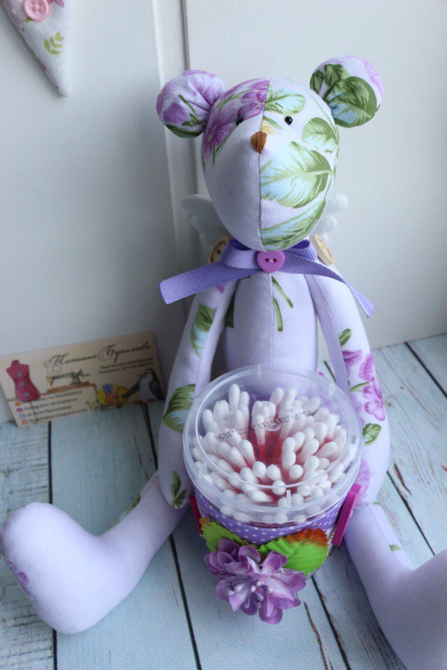 Мишка - хранитель ватных палочек. Полный рост 34 см, сидя - 19 см. Мишка сшит из хлопковой ткани приятного оттенка фиолетового. Мишка украсит собой ванную комнату или спальню, уголок, где его обладательница будет наносить макияж. Баночку можно использовать многократно. Мишка-ангелочек несомненно создаст уют и будет радовать своим ярким и аккуратным видом.