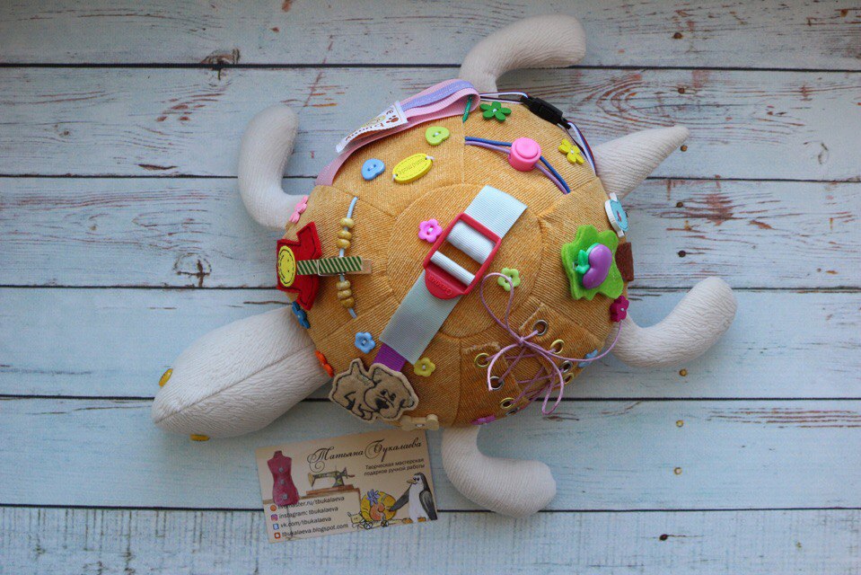 Развивающая игрушка черепашка, эта маленькая помощница познакомит ребенка с пуговкой, кнопкой, липучкой, прищепкой, шнуровкой, различными фиксаторами и крепежами. Черепашка сшита из мягких приятных тканей, все элементы яркие и частично съемные, а это значит, что черепашку можно спокойно брать с собой куда угодно и не бояться потерять мелкие детали.